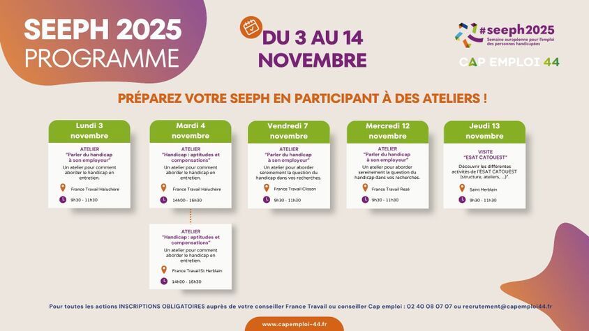 Du 3 au 14 novembre, CAP EMPLOI 44 vous propose une série d’ateliers, webinaires et rencontres pour vous préparer à la Semaine Européenne pour l’Emploi des Personnes Handicapées (SEEPH) 2025