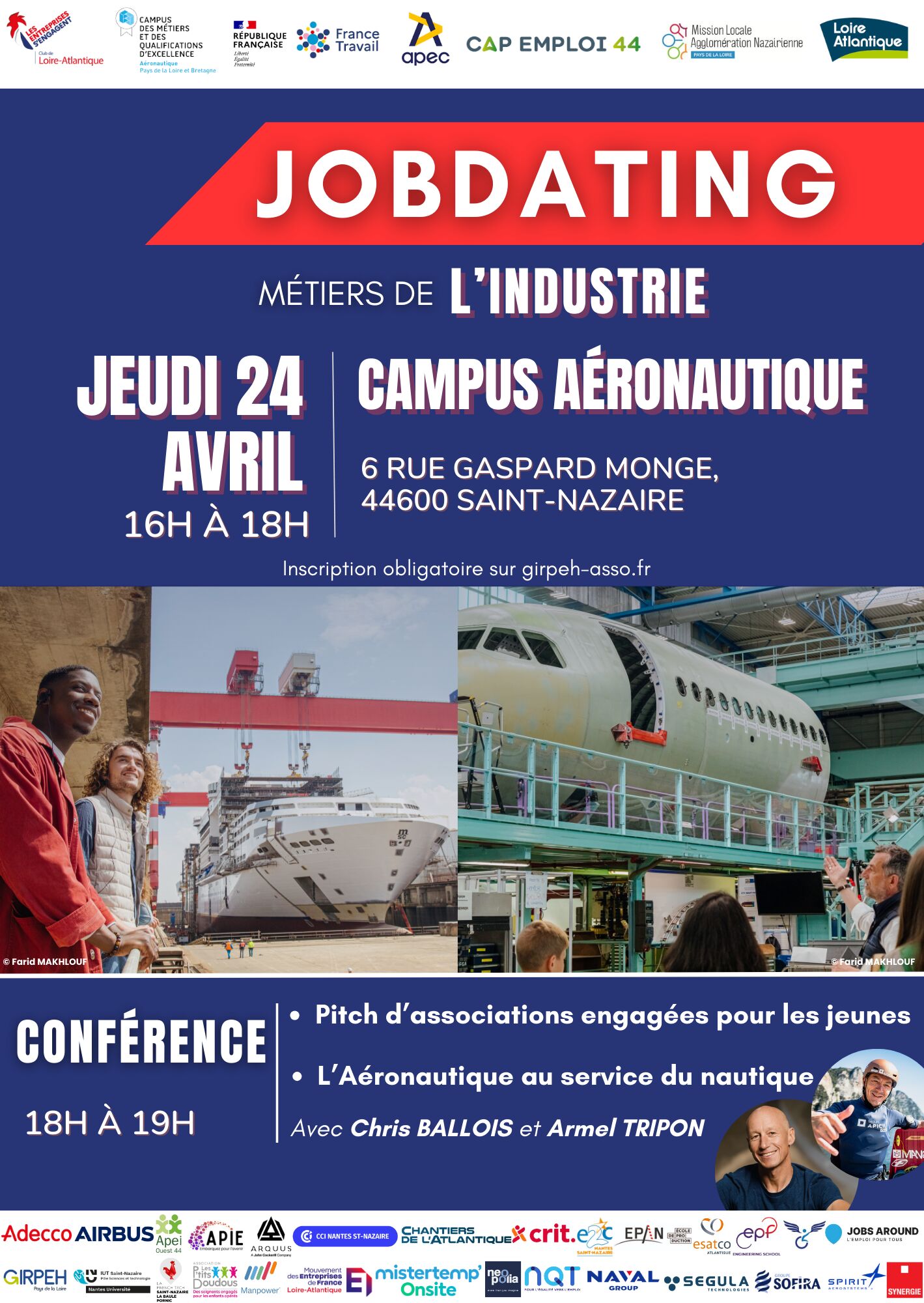 Au programme : • 16h00 – 18h00 : Jobdating spécial industrie ouvert à tous • 18h00– 19h15 : Conférence « L’Aéronautique au service du nautique » : Présentation du Campus et engagement pour la jeunesse Pitch d’associations engagées Intervention de Chris Ballois, athlète de haut niveau en kitesurf et E-foil, et Armel Tripon, skipper et navigateur professionnel, qui évoqueront comment l’industrie accompagne leurs performances sportives.